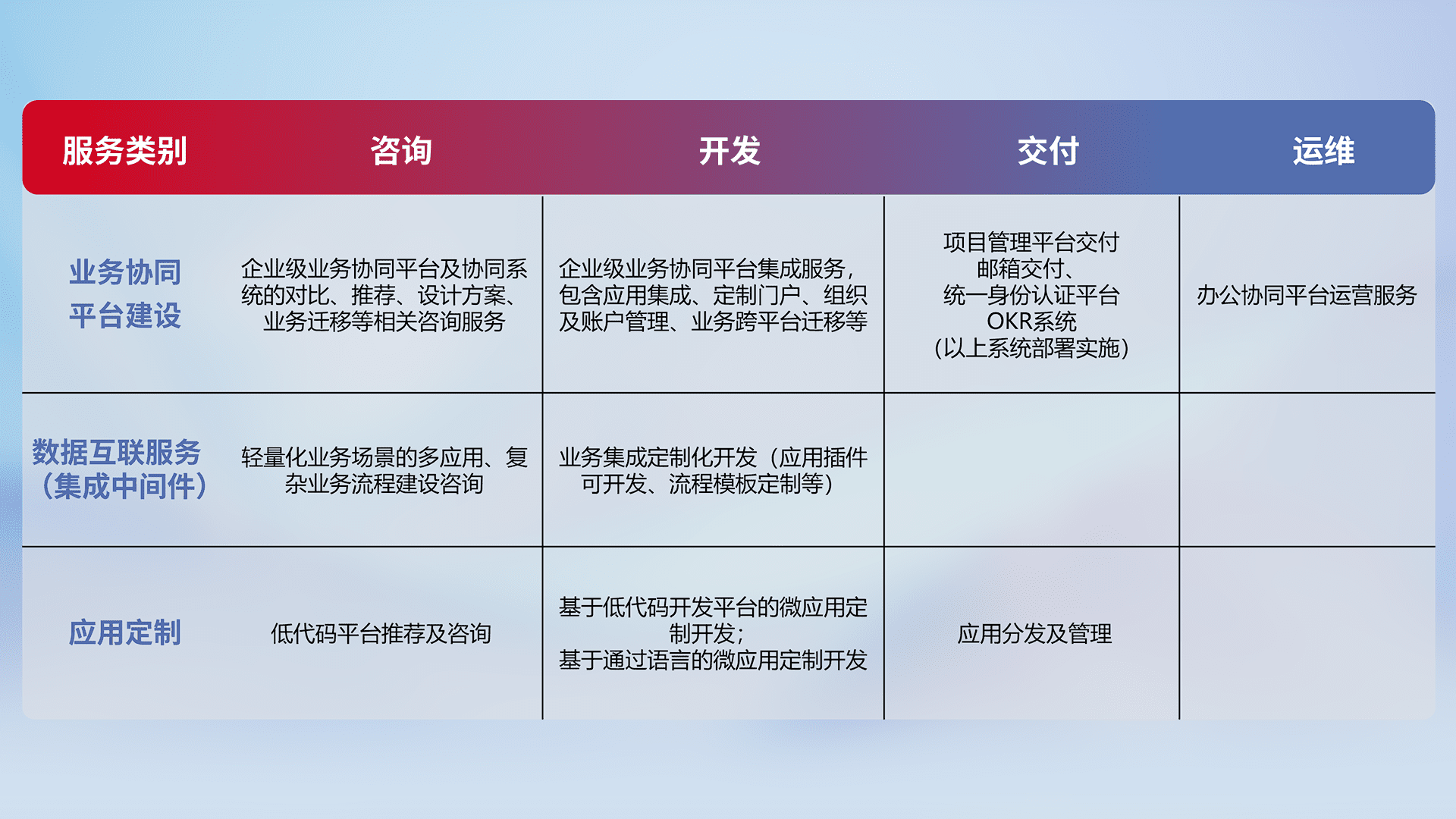 针对钉钉、、企微、、、IDaas等平台级产品提供产品的规划、、、方案、、交付、、、定制化开发等服务,,,实现如统一协同办公、、、、智能客户服务、、、、混合会议管理、、、智能数据查询、、、、等业务场景,,实现数字化转型。。。。